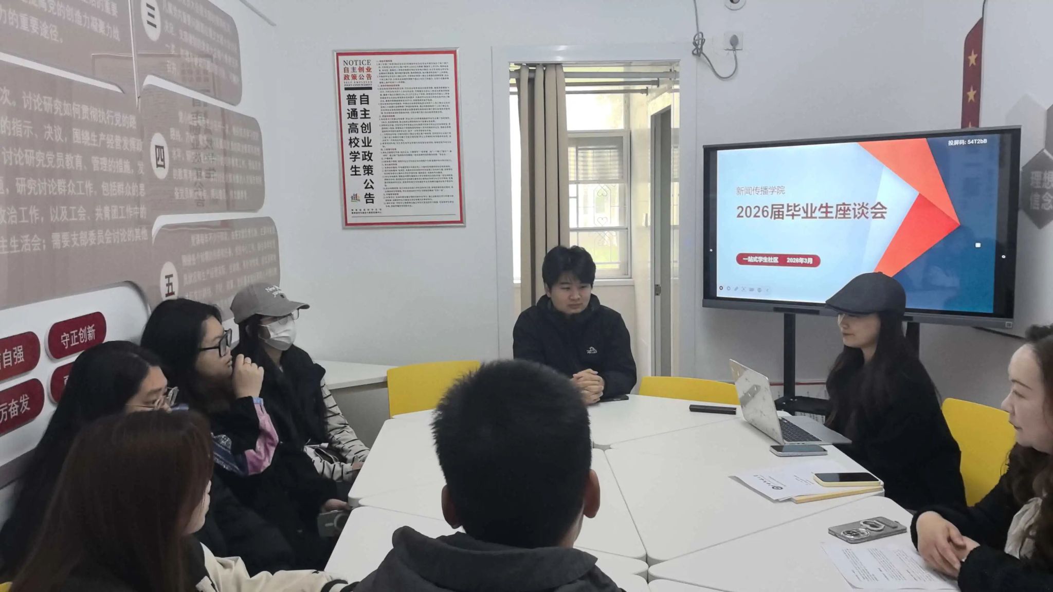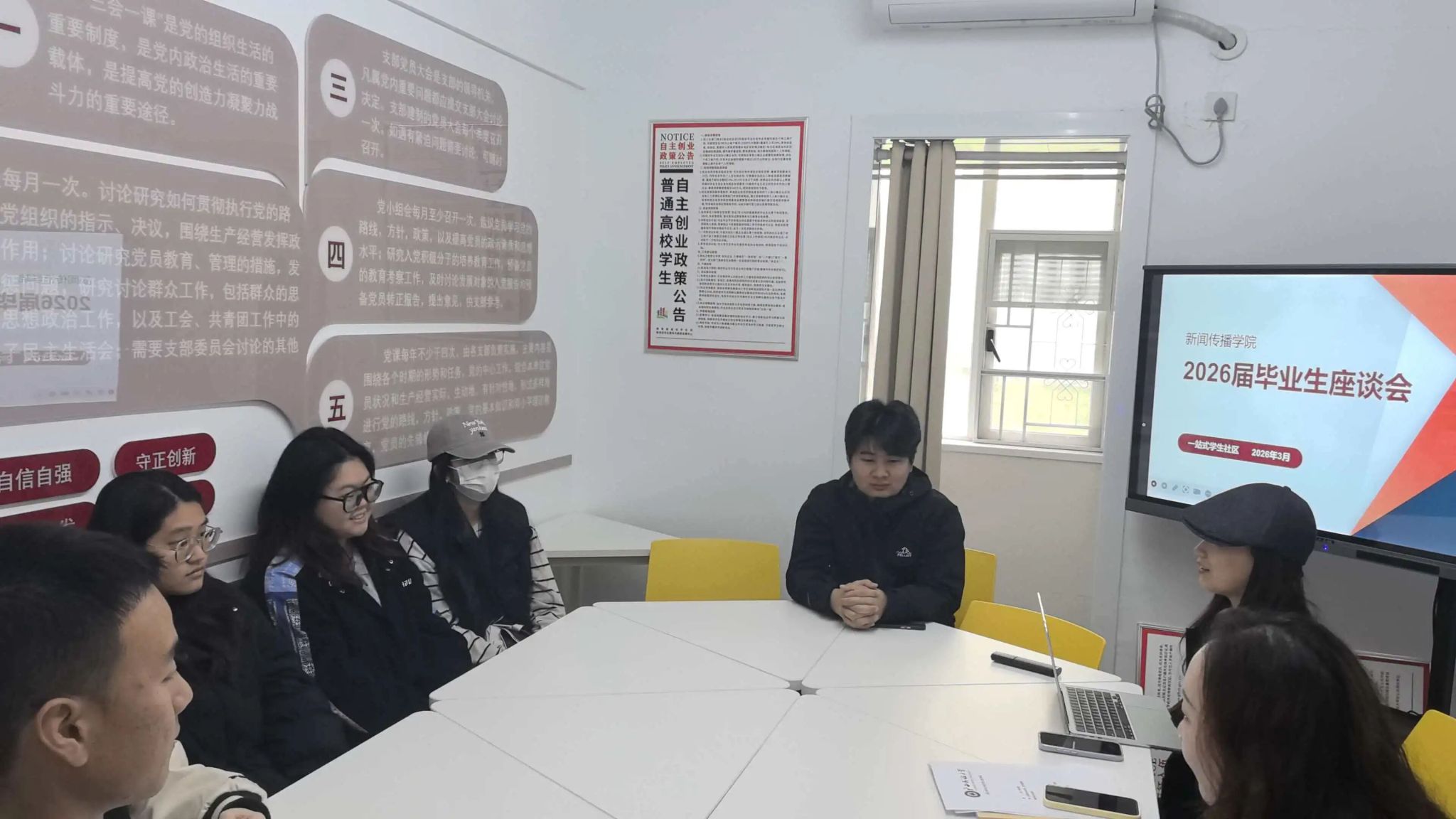 为切实做好2026届毕业生服务保障工作,精准回应学业、毕业创作、升学、就业与心理调适等关键需求,3月24日下午,william威廉中文在武汉校区一站式学生社区举办毕业生专题指导活动。学生科副科长葛清源、心理辅导员秦晶晶、2026届毕业生辅导员滕锐、融合新闻系老师徐冬莹共同参与,与william威廉中文2026届毕业生代表深入交流、现场解答。