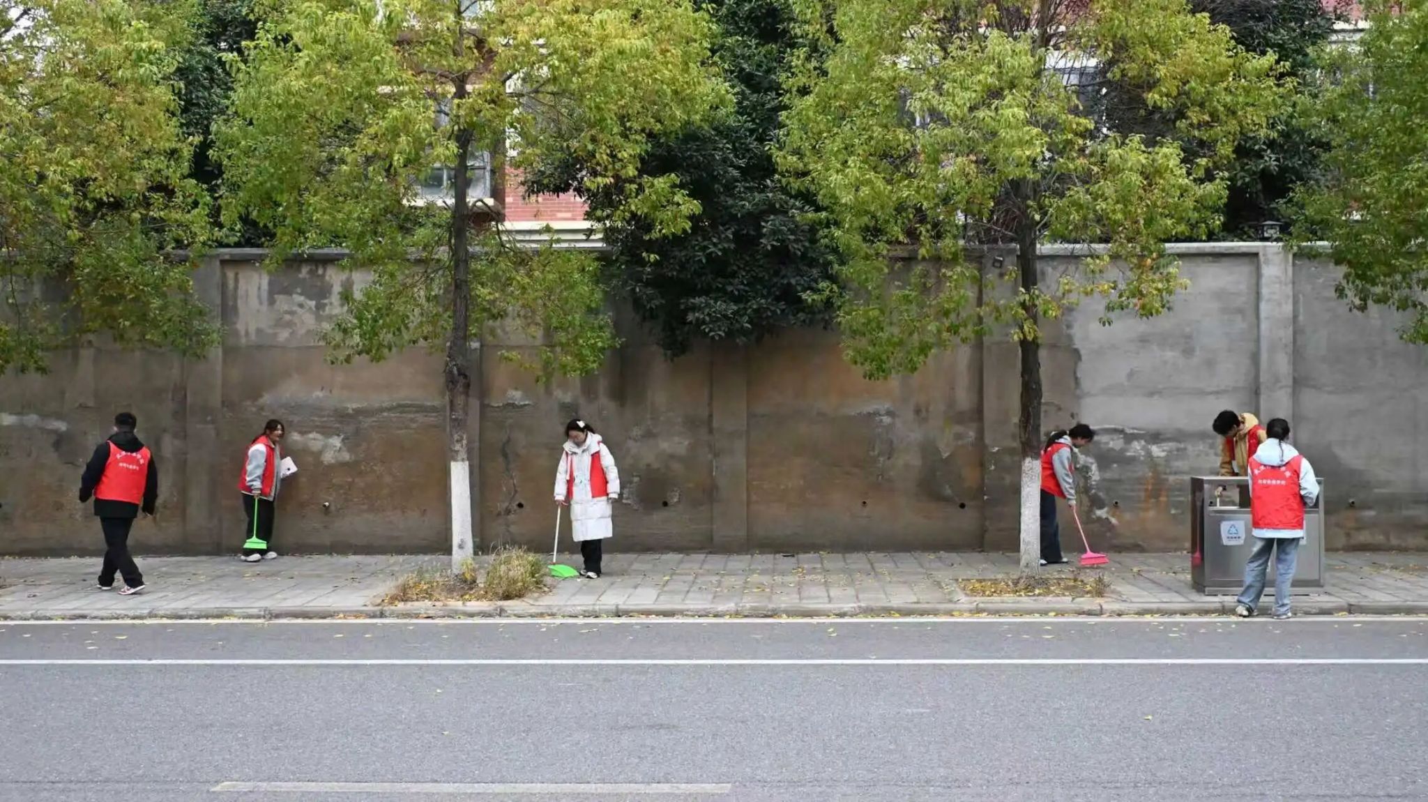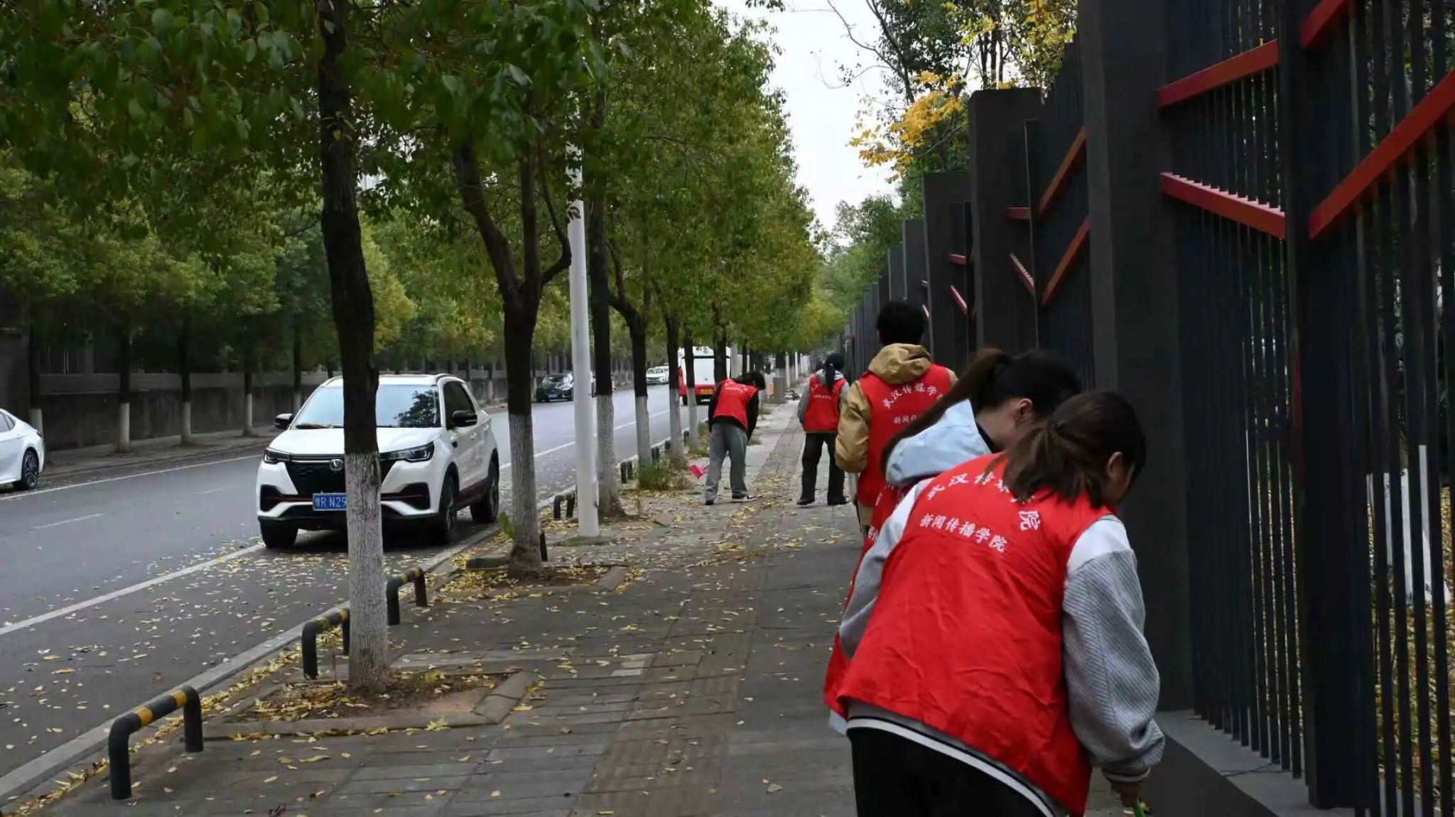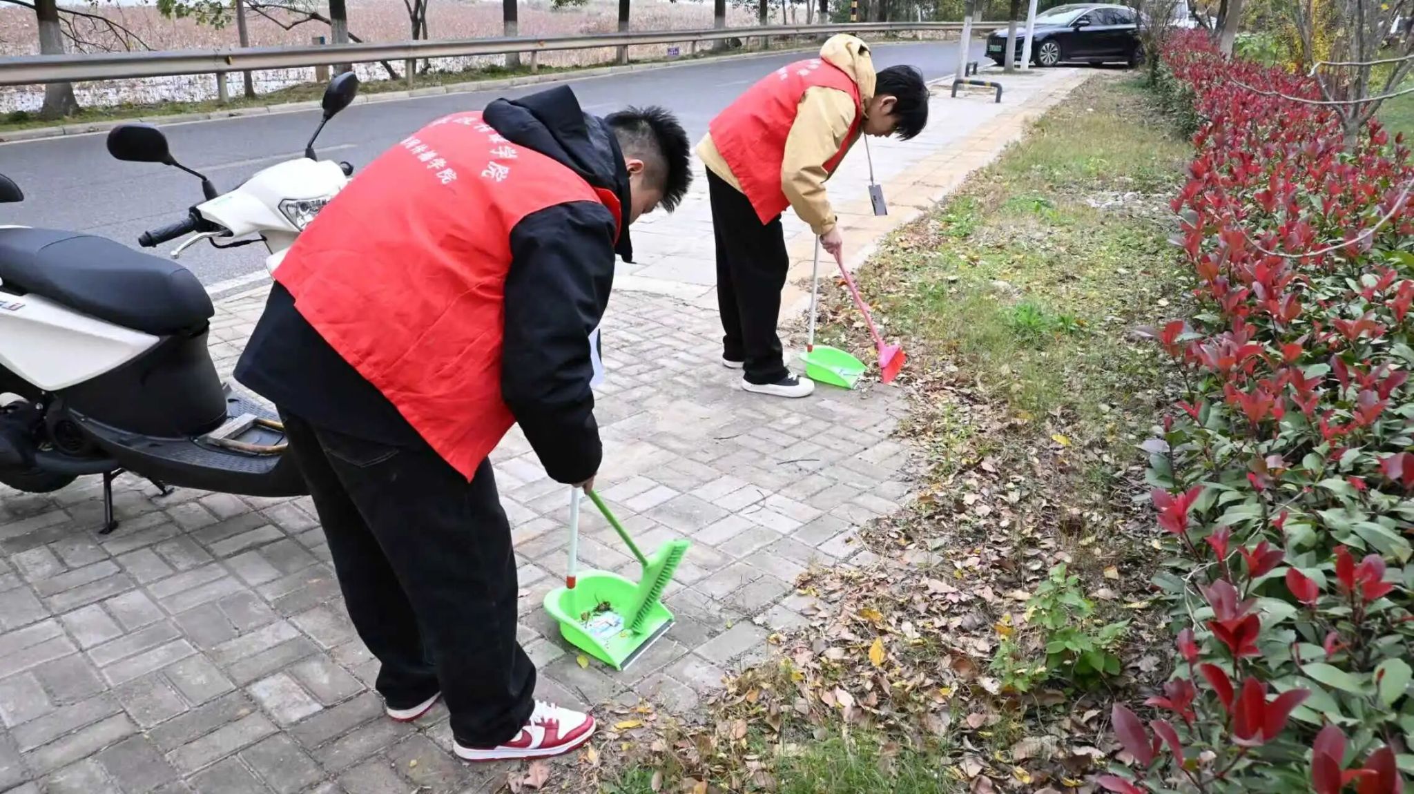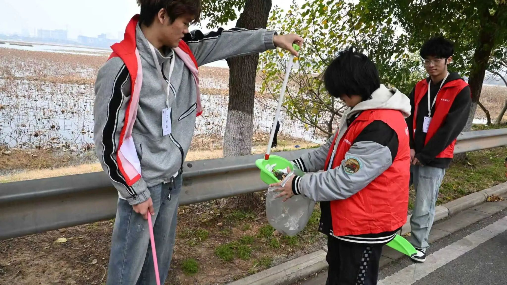 活动当天,同学们早早集结后分组行动。针对沿湖路段草丛、步道、石缝等卫生死角,大家各司其职:有的挥 帚清扫散落落叶,有的徒手 捡拾塑料瓶、纸屑等垃圾,有的负责分类装袋。