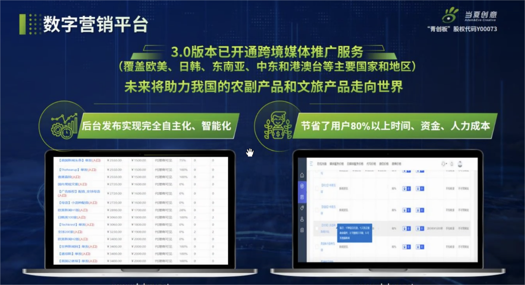 当夏科技平台的数字营销平台3.0版本已开通跨境媒体推广服务,未来将助力我国的农副产品和文旅产品走向世界,后台发布实现完全自主化、智能化,节省了用户百分之八十以上时间、资金、人力成本。