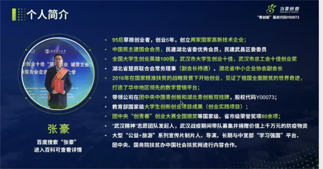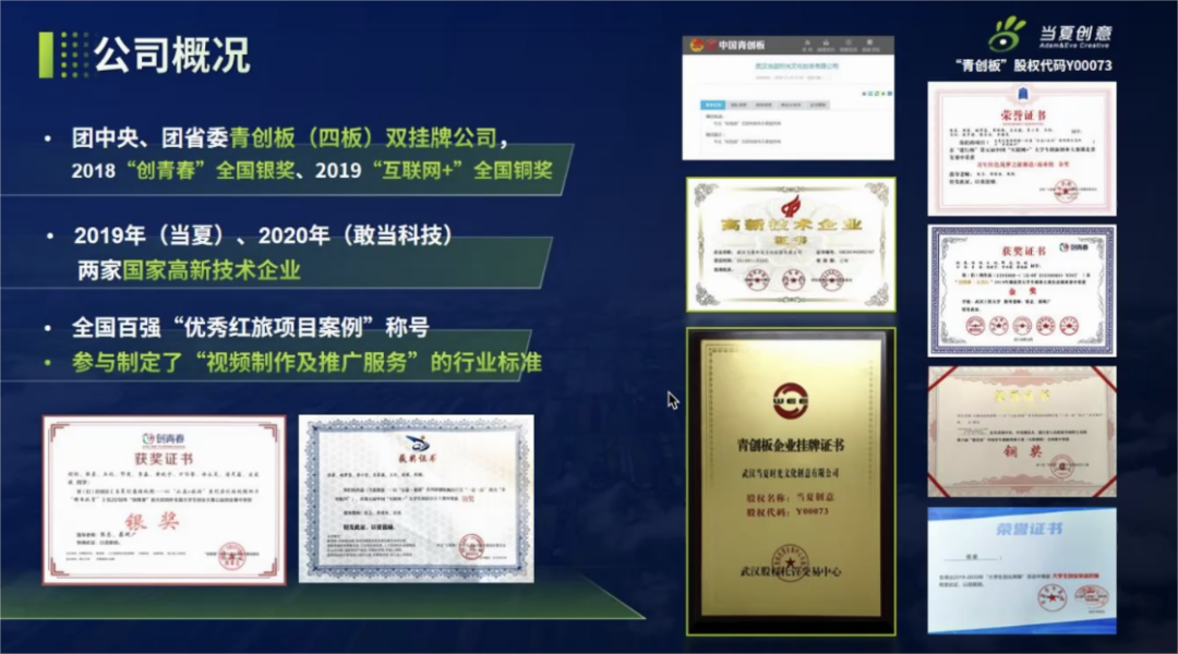 该公司由95后草根创业者张豪创建,该司参与制定了“视频制作及推广服务”的行业标准,获得了全国百强“优秀红旅项目的案例”称号。在2018年获得了“创青春”全国银奖,2019年获得了“互联网+”全国铜奖,是国家高新技术产业。