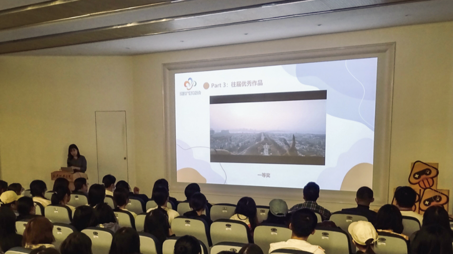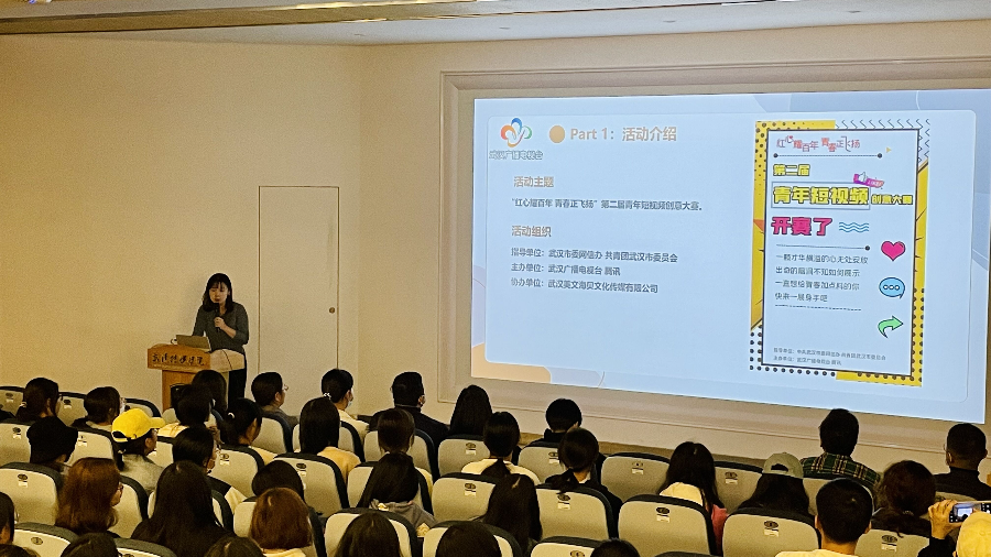 介绍完大赛相关事宜,张婷婷老师还给同学们观看了上一届大赛的部分获奖作品,据老师介绍,上一届比赛的主题是“武汉七十年,青春正飞扬”,因此上一届的获奖视频以城市游记为主。新小传还发现,在观看的三个优秀获奖视频中就有一条视频是武传学子所制作。此外,张老师还给我们观看了几部进入武汉广播电视台实习的同学所制作的视频,其中有一条视频曾被新华网、人民网等大型媒体转发,收获了超过2000万次的观看和点赞,在场的同学都惊叹于他们高超的视频制作技术。